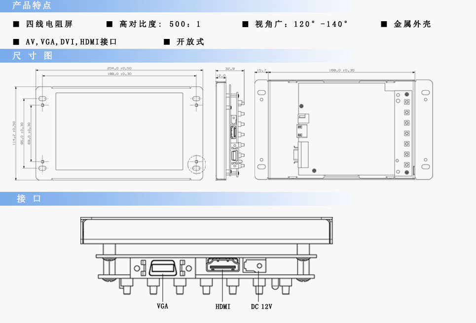 輸入信號:RCA Video×2,RCA Audio×1,VGA×1,DVI×1,HDMI×1
