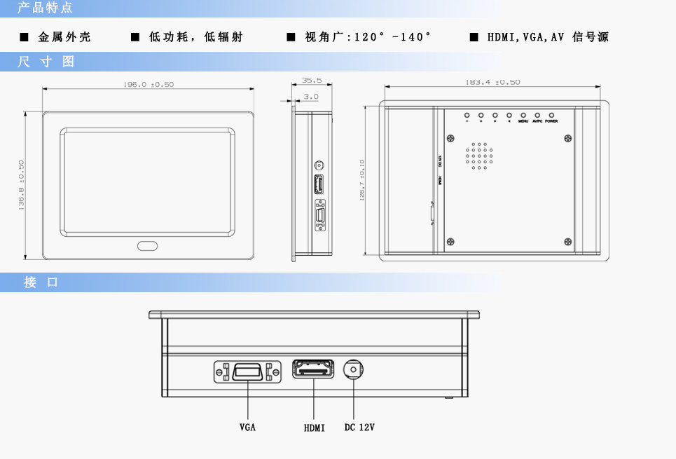 輸入信號:RCA Video×2, RCA Audio×1, VGA×1, DVI×1, HDMI×1