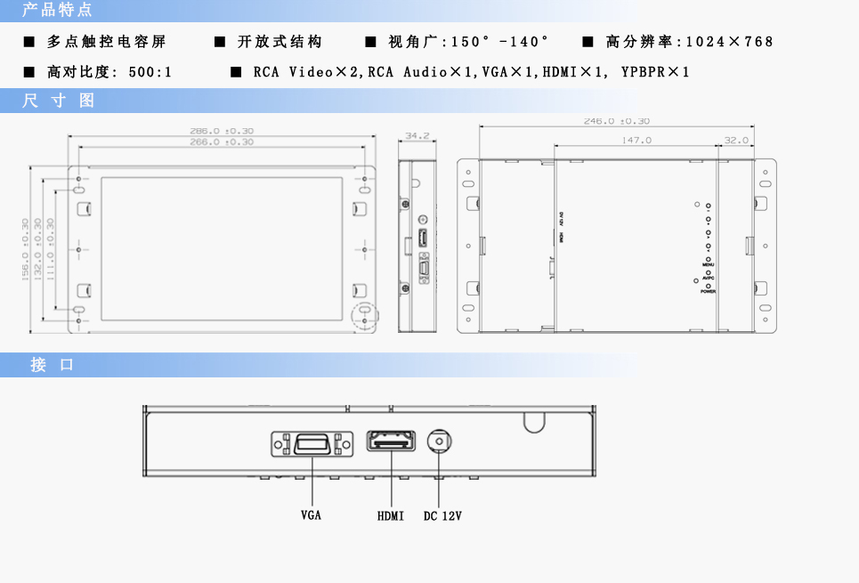 輸入信號(hào):RCA Video×2,RCA Audio×1,VGA×1,DVI×1,HDMI×1