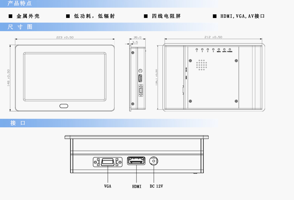 輸入信號:RCA Video×2, RCA Audio×1, VGA×1, DVI×1, HDMI×1